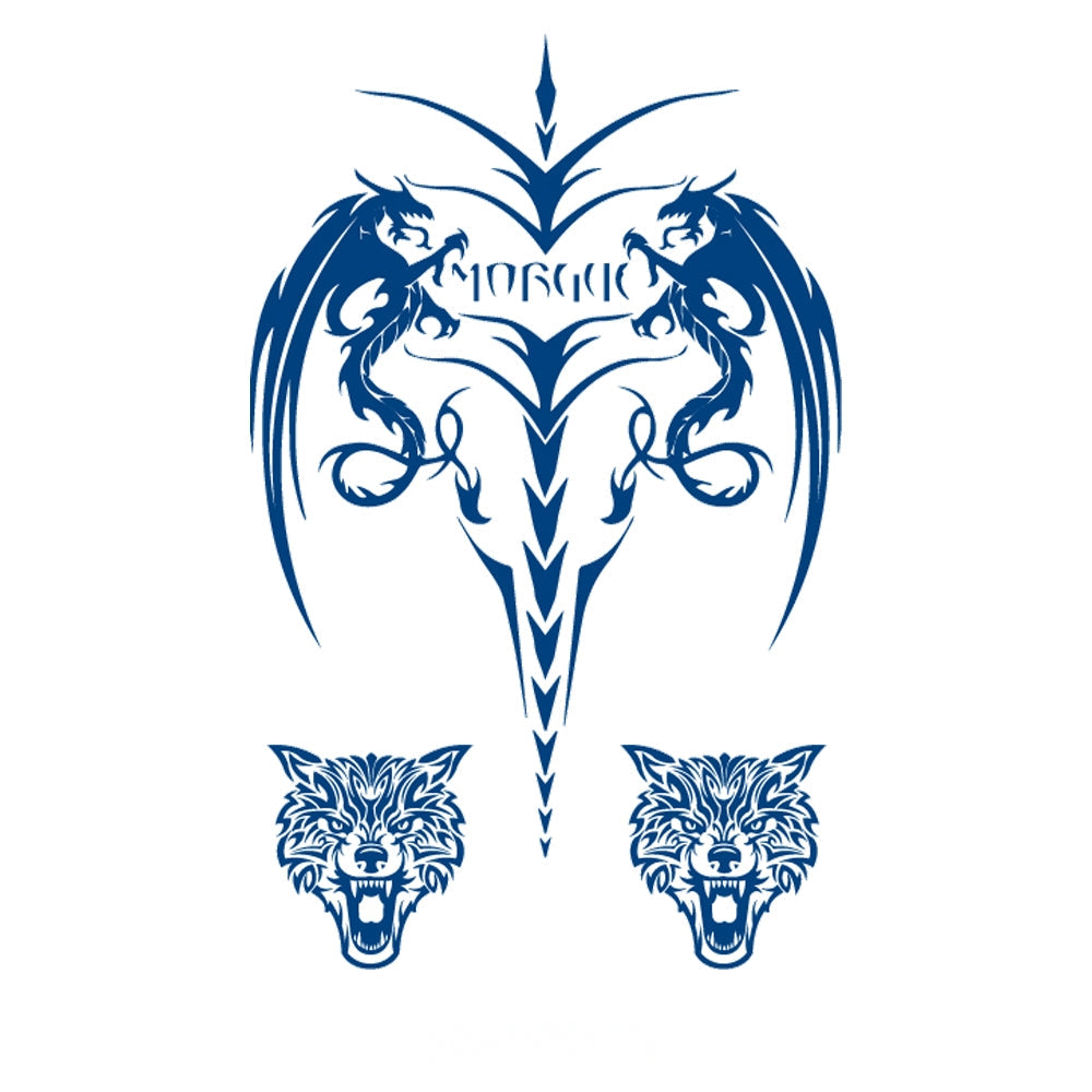 Two mirrored dragons entwined with tribal patterns, accompanied by fierce wolf heads—symbolizing protection, loyalty, and the unstoppable force of primal power.