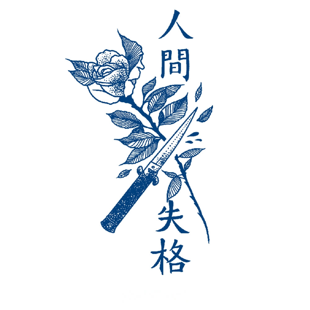 A blooming rose entwined with a dagger, framed by Japanese kanji meaning No Longer Human—symbolizing fragility, inner conflict, and the tragic balance between life and suffering.