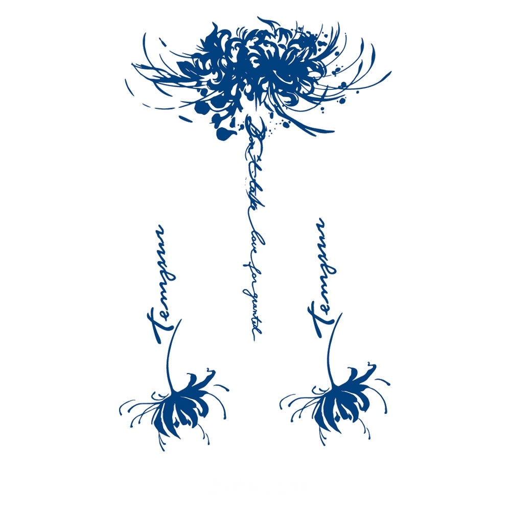 A grand blossom with delicate script descending, paired with two smaller flowers inscribed “Tempus.” This design embodies the fleeting nature of time, the beauty of life’s moments, and the enduring strength of love.