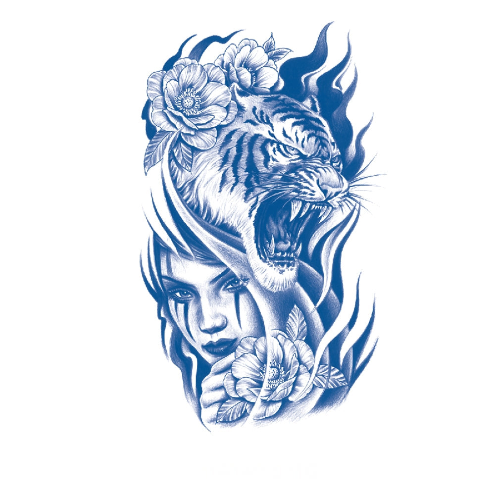 A fierce tiger roars with unstoppable power, while a woman’s calm, painted face peers through the storm, framed by delicate flowers. The design embodies the duality of existence—strength and vulnerability, savagery and elegance—reminding us that true beauty lies in the harmony of contrasts.