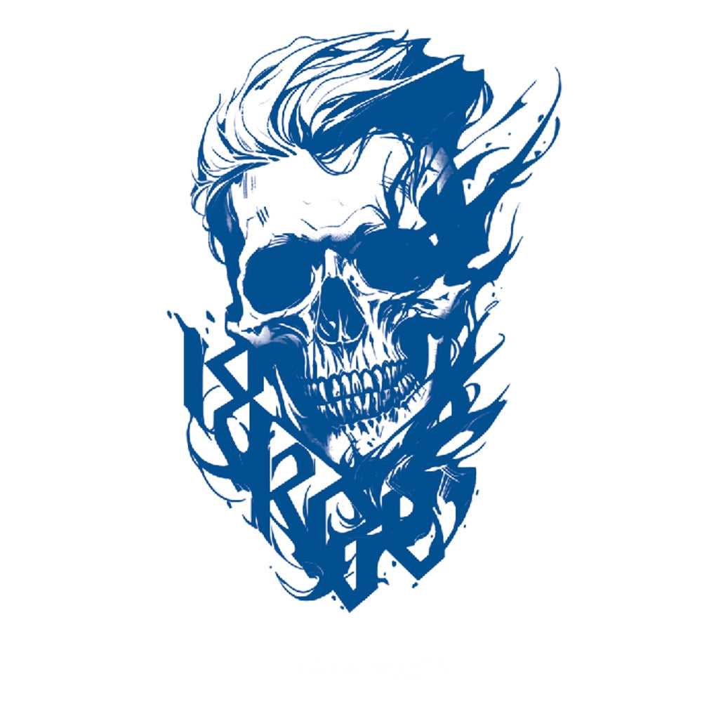 A skull crowned with flowing hair, engulfed in fiery shadows, symbolizes mortality, transformation, and the unyielding fire of existence. A bold emblem of resilience and the beauty within impermanence.