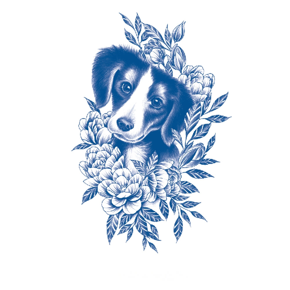 A sweet pup framed by delicate blossoms, representing loyalty, innocence, and the warmth of unconditional love. A design that radiates companionship and heartfelt devotion.