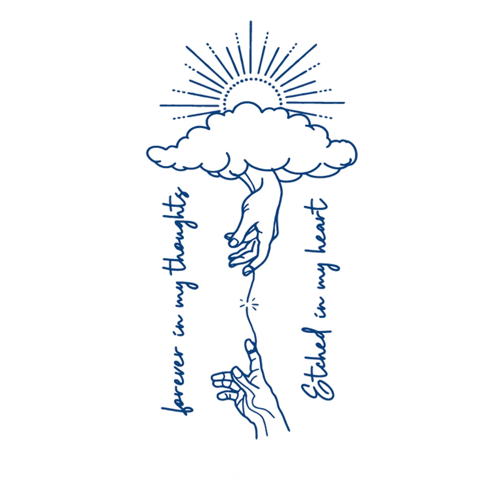 Two hands reaching across the divide, one descending from the heavens, the other reaching upward—linked by a spark of light beneath the sun’s rays. A symbol of unbreakable connection, love that transcends distance, and the eternal presence of those we hold dear.