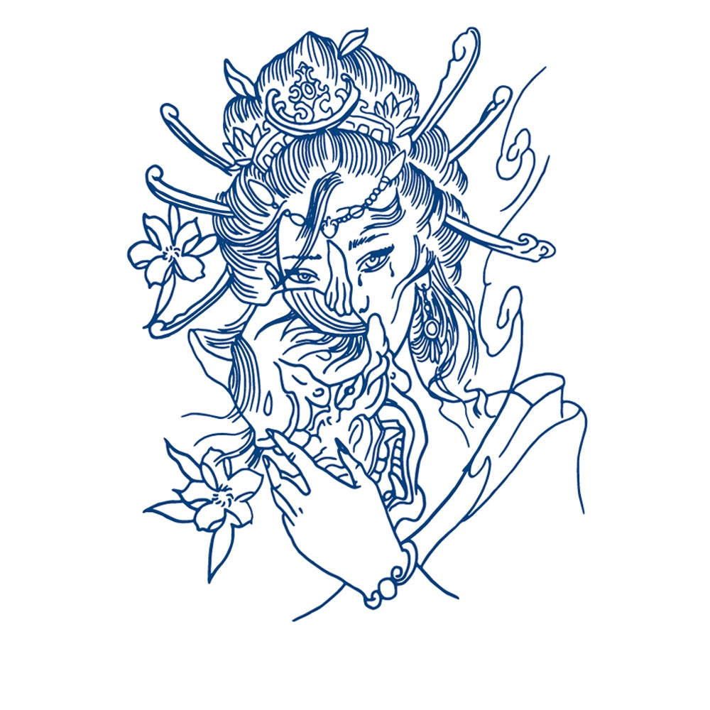 A regal woman crowned with ornaments and blossoms, concealing herself behind a fearsome mask, symbolizing the duality of elegance and power, light and shadow, truth and illusion.