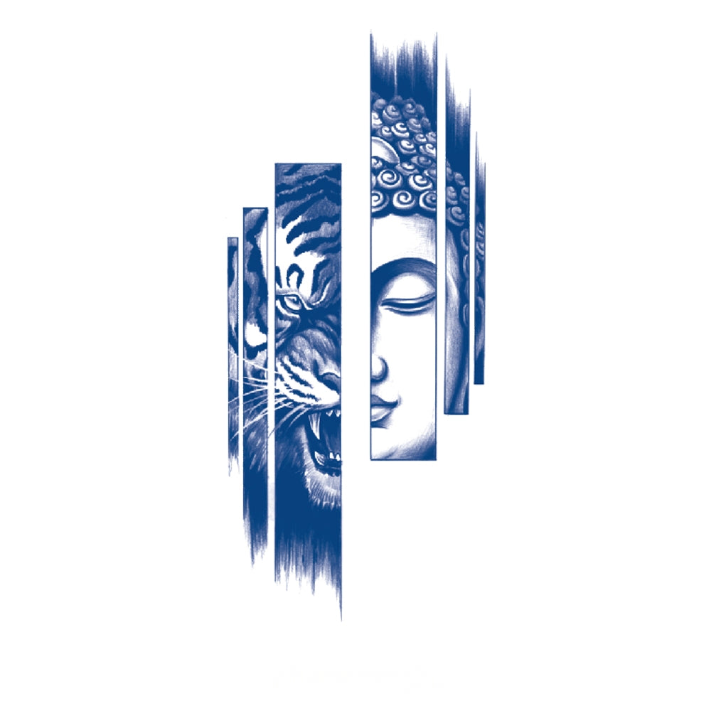 A tiger’s snarl collides with the calm face of Buddha, divided by fragmented lines. This design symbolizes the eternal struggle and harmony between primal instinct and spiritual enlightenment.