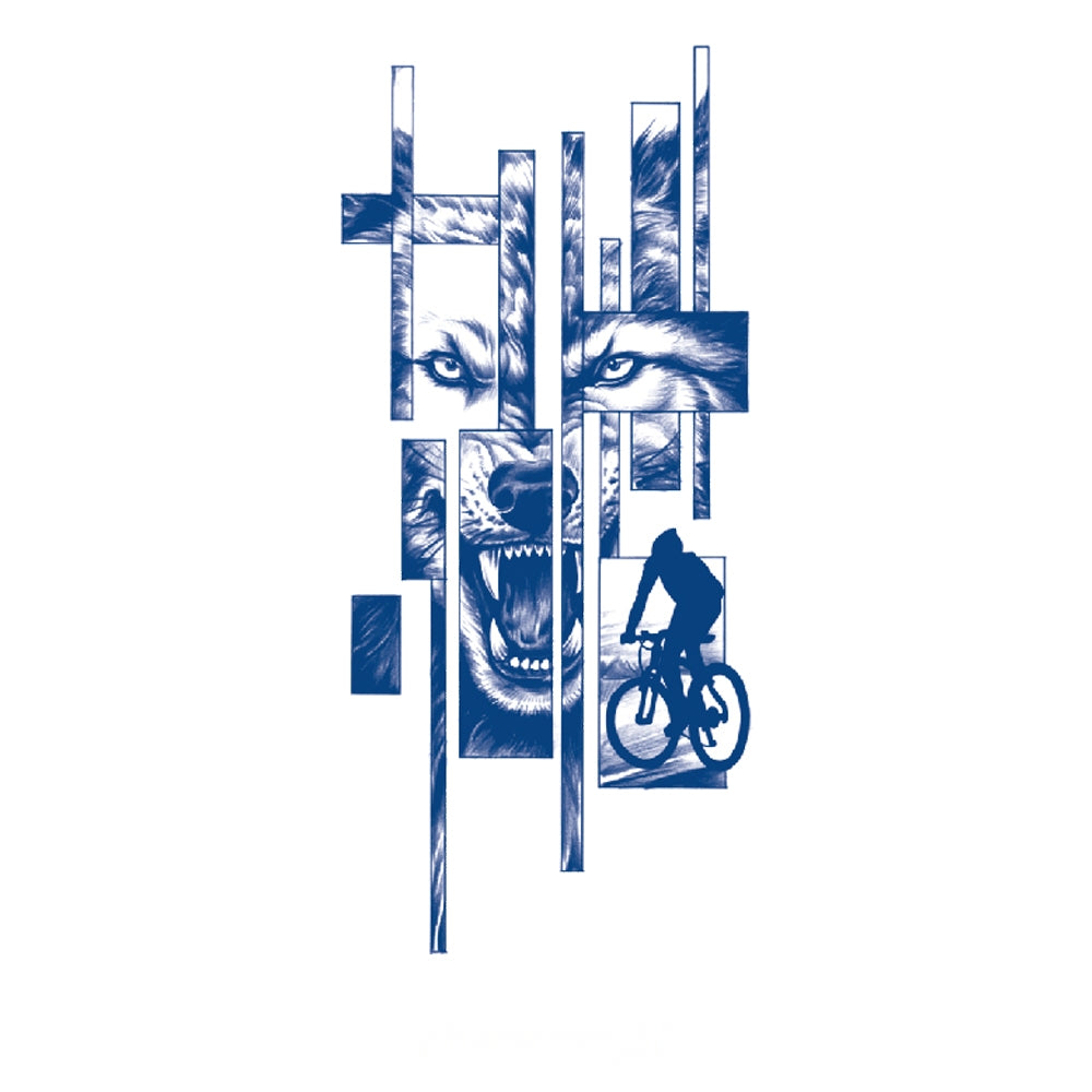 A fragmented wolf snarls through broken panels, its gaze fixed on the lone cyclist riding into the horizon. This design symbolizes determination, resilience, and the primal drive to keep moving forward no matter the obstacles.