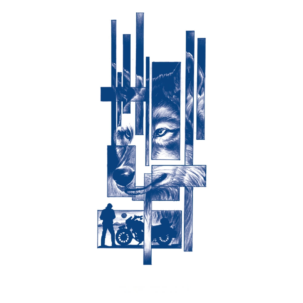 A fragmented design reveals the piercing gaze of a wolf above the silhouette of a rider with his motorcycle. This piece symbolizes independence, loyalty, and the untamed spirit that follows its own path beneath the open sky.