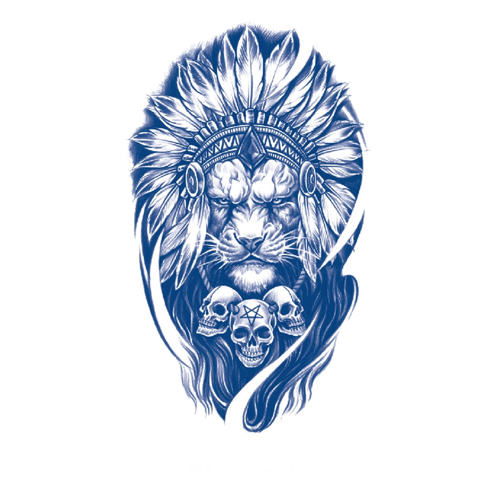 A fierce lion adorned with a feathered headdress stares with unyielding eyes, three skulls beneath marking his dominion over life and death. This design embodies power, authority, and the untamed spirit of a ruler born to command.