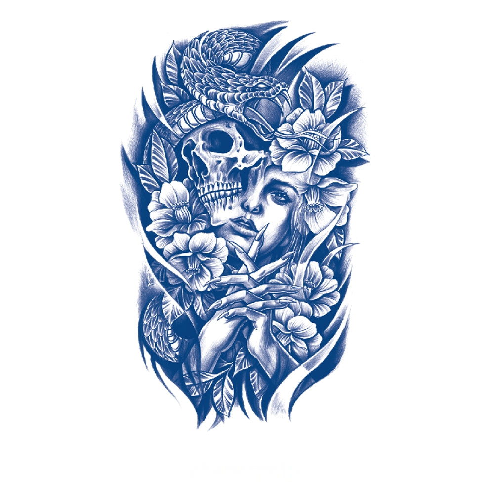 A haunting fusion of beauty and decay—flowers blooming around a woman’s face entwined with a skull, while a serpent coils above as guardian and tempter. This design symbolizes mortality, rebirth, and the delicate balance between creation and destruction.