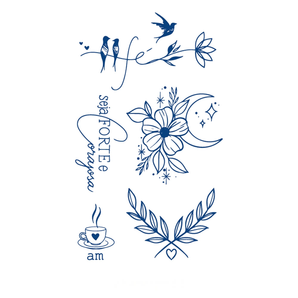 A delicate collection of tattoos featuring birds of freedom, blooming flowers under the crescent moon, and words of encouragement in Portuguese: 'seja FORTE e corajosa' ("be strong and courageous"). Balanced with simple motifs of laurel leaves and a warm cup of love, these designs embody strength, tranquility, and the beauty of everyday moments.