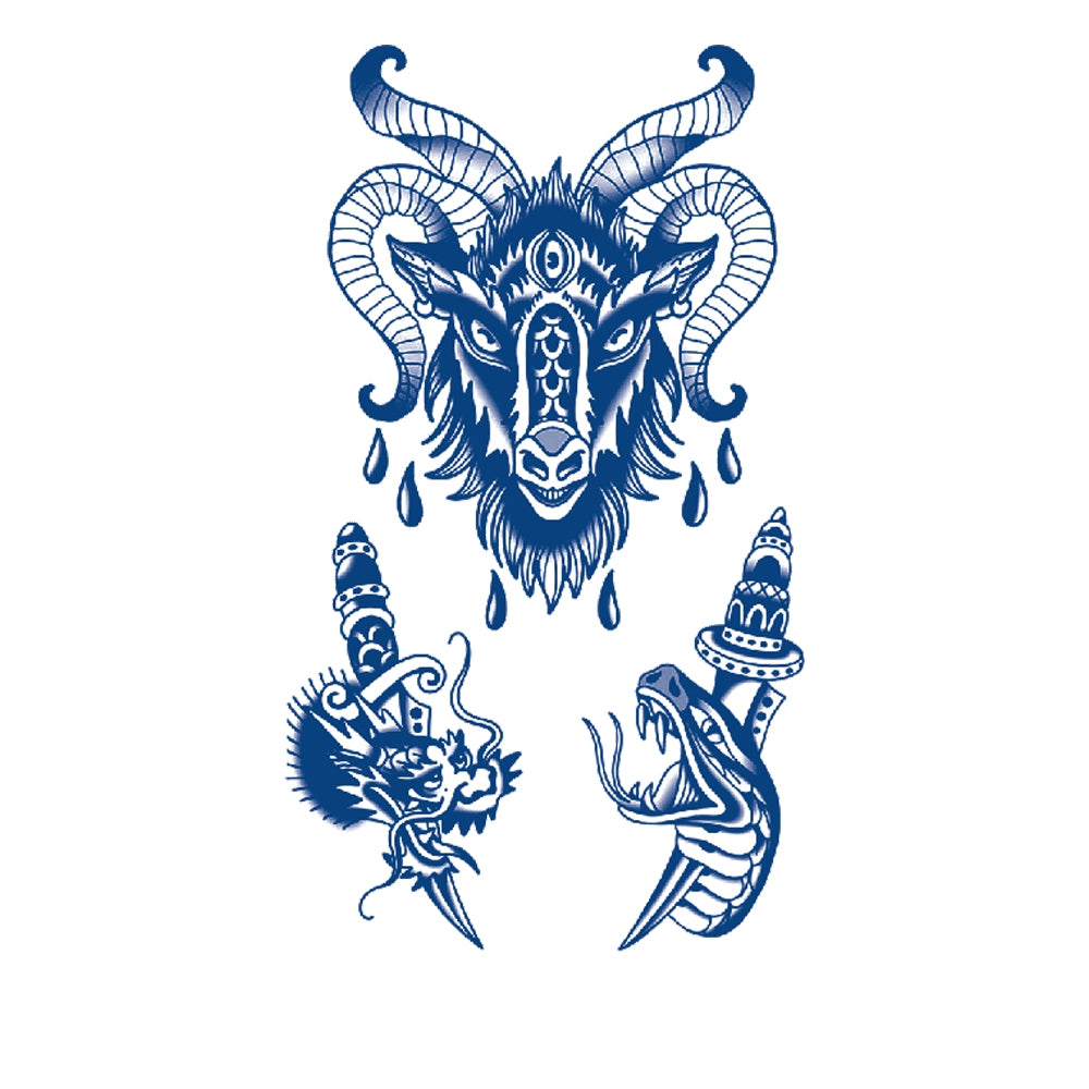A horned goat head with mystical markings and dripping tears, paired with dagger-pierced designs of a dragon and a serpent. This tattoo embodies defiance, raw energy, and the eternal clash between chaos and power.