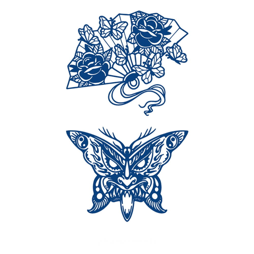 A delicate fan adorned with roses and butterflies symbolizes elegance, beauty, and fleeting moments of serenity. Beneath it, a fierce demonic butterfly mask embodies transformation, duality, and the hidden strength behind fragile wings.