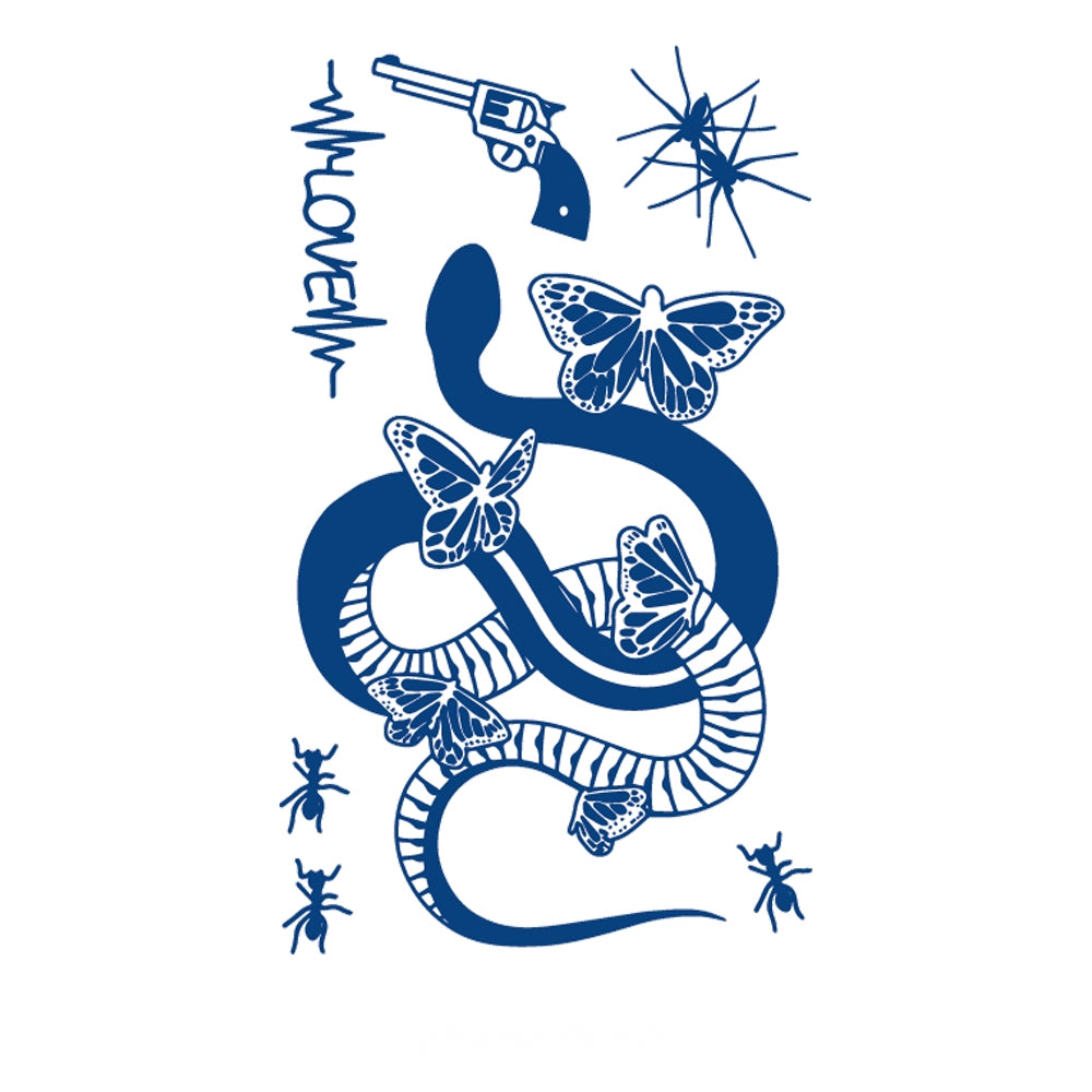 A serpent winds through fragile butterflies, watched by crawling ants and marked by the presence of a gun and shattered glass—an image of contrasts where love, fragility, and violence collide.