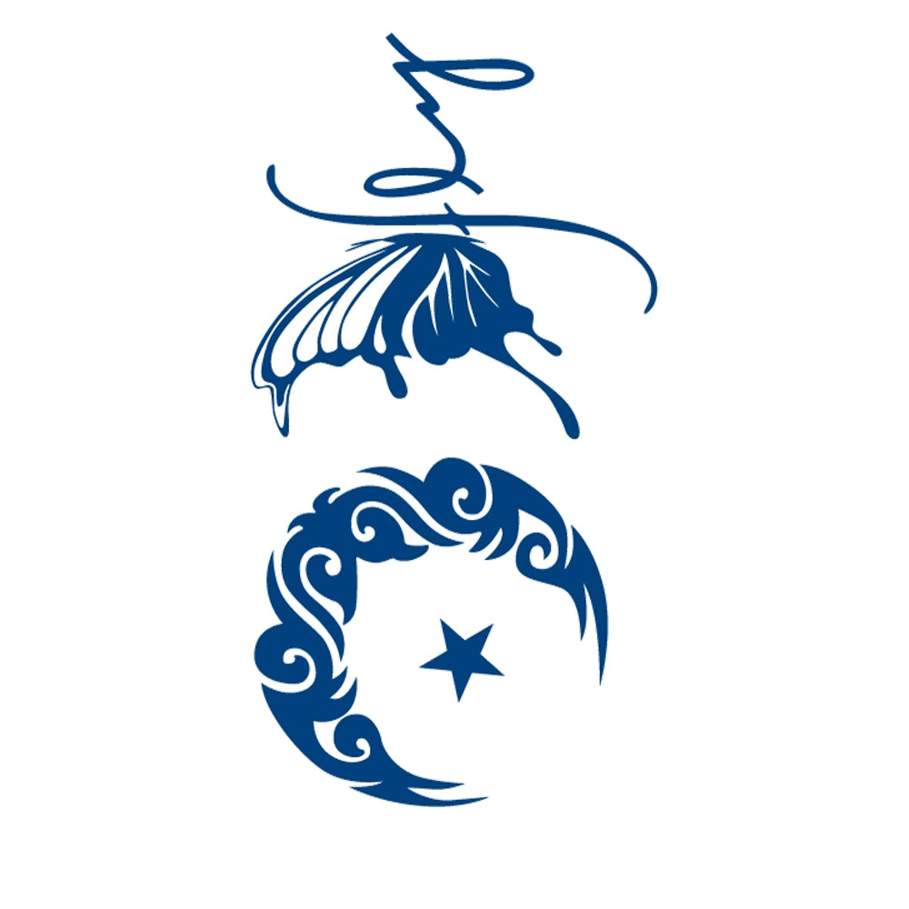A delicate butterfly in flight paired with a crescent embracing a star—symbols of freedom, change, and the eternal dance between light and night.