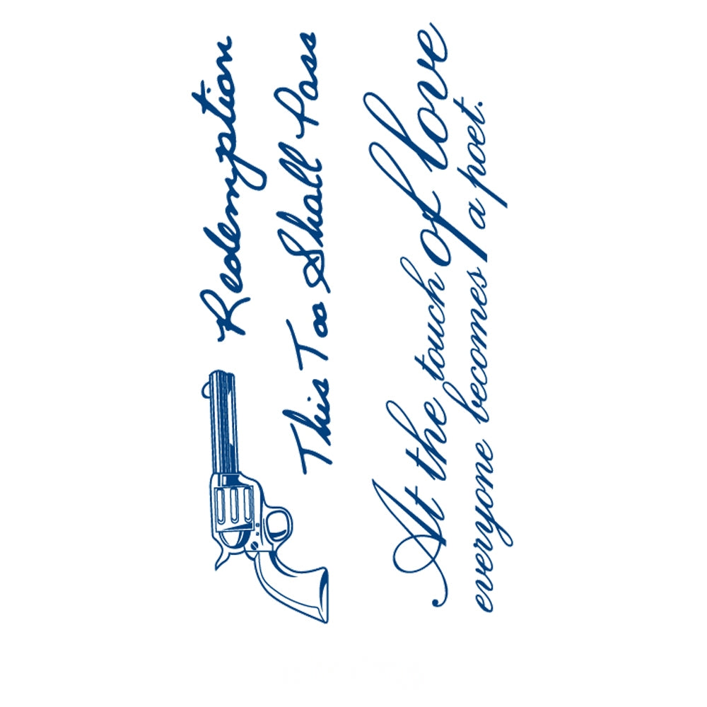 This tattoo unites bold words like “Redemption” and “This Too Shall Pass” with the poetic line “At the touch of love, everyone becomes a poet.” Alongside the revolver, it reflects resilience, transformation, and the redemptive power of love even through struggle.