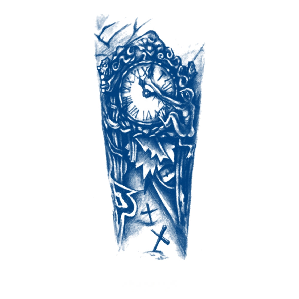 An ornate clock towering above broken crosses symbolizes the inevitability of time—marking both the fragility of life and the endurance of legacy beyond the grave.