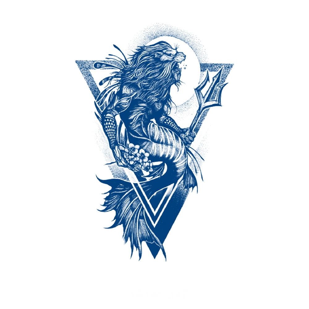 A mighty lion-merman wielding a trident rises from the waves, merging primal strength with oceanic power — symbolizing dominance, courage, and mastery over both land and sea.