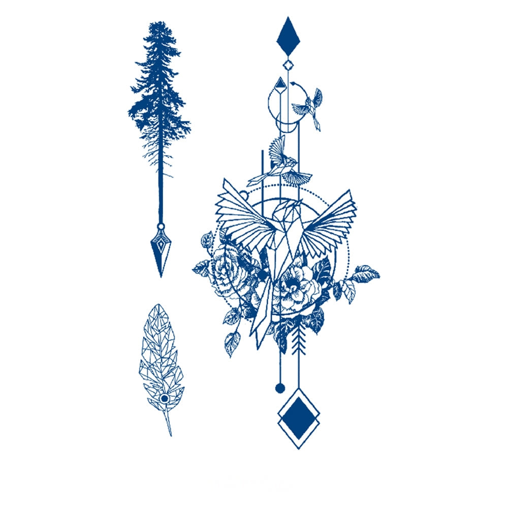 A geometric bird rises among blooming roses, moons, and intricate patterns—flanked by a feather and a rooted tree—symbolizing strength, harmony, and spiritual awakening.