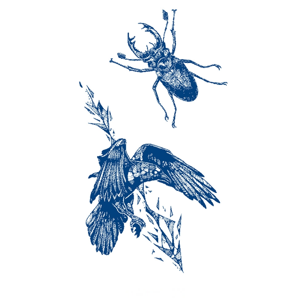 A detailed depiction of a beetle above and a bird below, symbolizing the contrast between grounded resilience and soaring freedom, capturing the eternal struggle and harmony within nature.