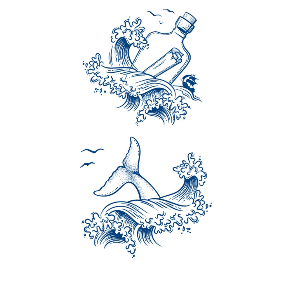 The design pairs a bottle adrift with a hidden message and a whale’s tail breaching the sea, symbolizing mystery, exploration, and the eternal connection between humanity and the ocean.