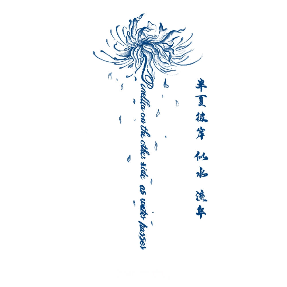 A delicate flower scatters petals into a stream of words, symbolizing transience, renewal, and the eternal flow of existence.