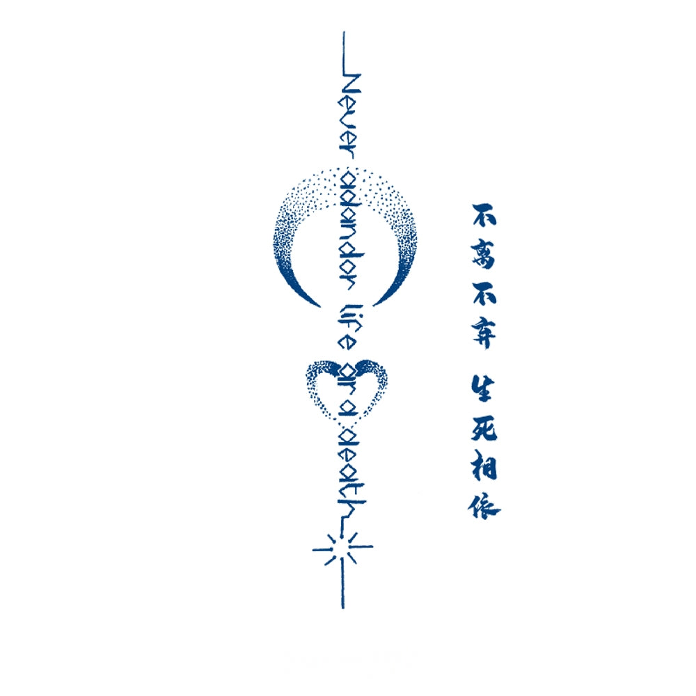 A crescent, heart, and guiding star align with flowing words, symbolizing eternal devotion, unity, and the promise of standing together through all of existence.