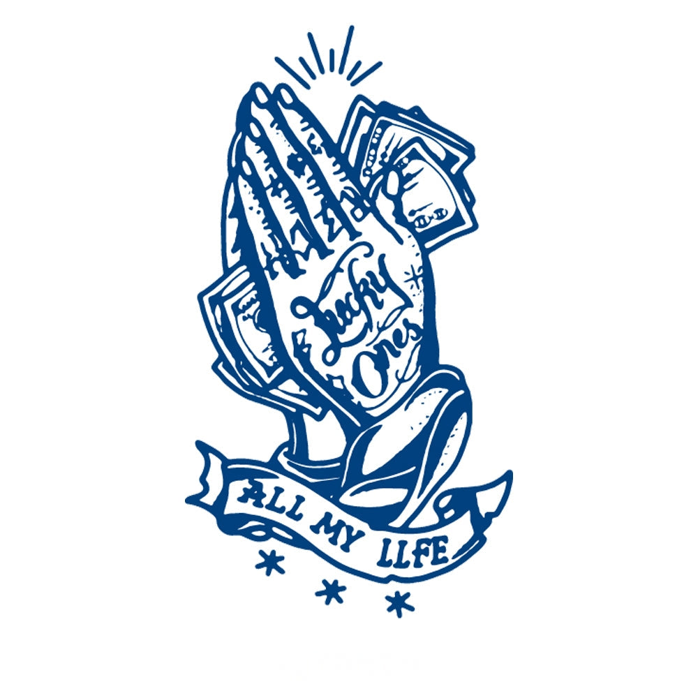 Praying hands marked with the words Lucky Ones, surrounded by dollar bills and a banner reading All My Life—a bold emblem of thankfulness, resilience, and the blessings of perseverance.