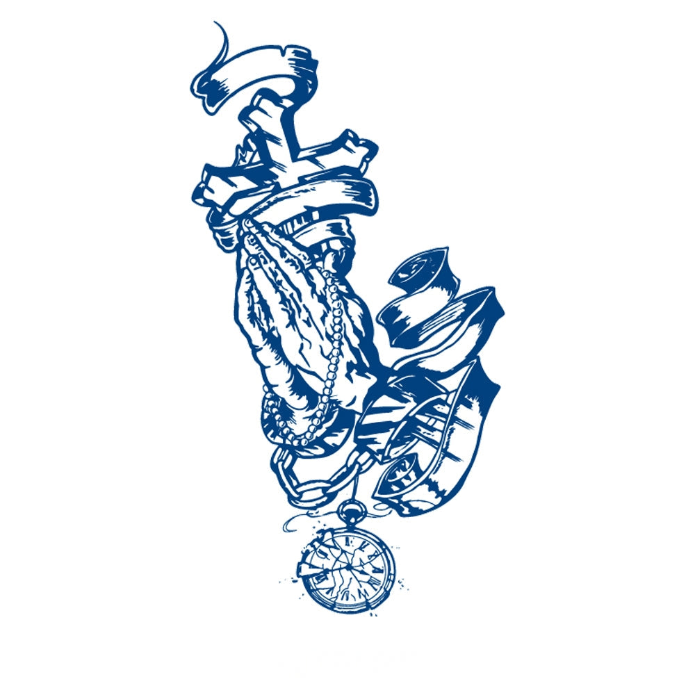 Praying hands bound with a rosary, holding a shattered pocket watch beneath a cross—signifying devotion, resilience, and the eternal power of belief over fleeting moments.
