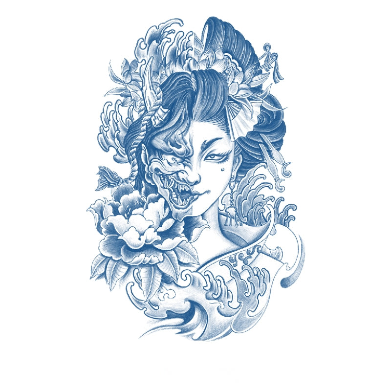 A graceful woman with half her face transformed into a demon, surrounded by waves and blooming flowers—symbolizing inner conflict, hidden strength, and the fragile line between light and shadow.