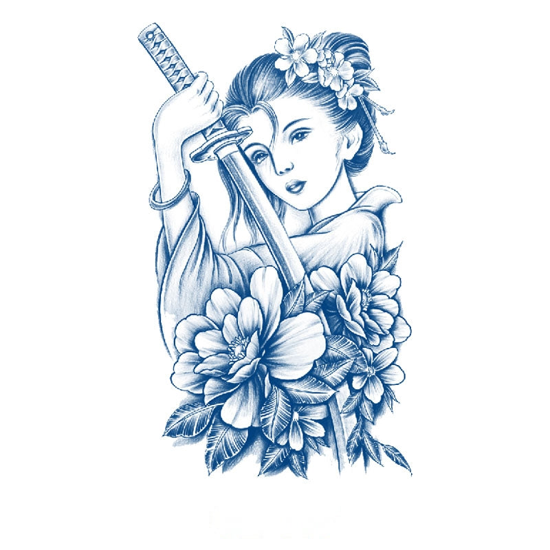 A poised geisha holding her katana among blooming flowers, symbolizing honor, resilience, and the balance of elegance with strength. This design reflects inner power, calm determination, and timeless grace.