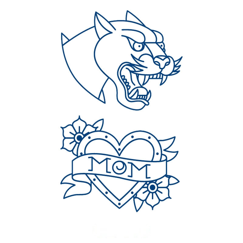 A roaring panther symbolizing courage and protection, paired with a heart inscribed with “MOM” surrounded by flowers—representing unconditional love, loyalty, and the fearless bond of family.