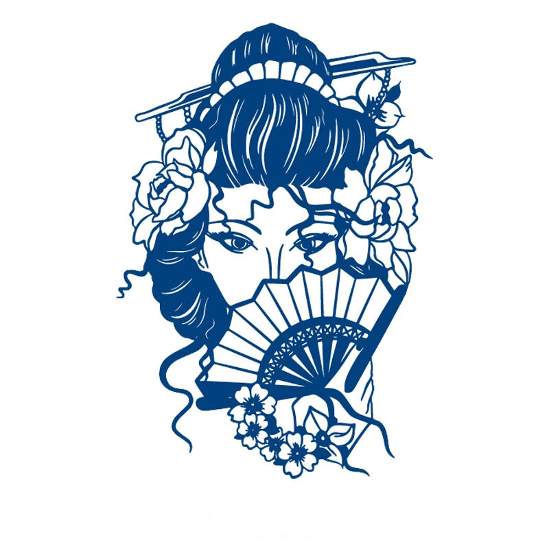 A captivating geisha adorned with blossoms, concealing her lips behind a delicate fan—symbolizing beauty, poise, and the timeless allure of hidden strength.