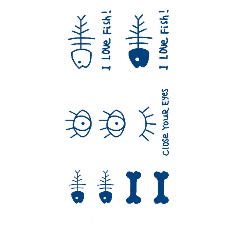 Fish bones, blinking eyes, and bold bones paired with short phrases give the set a light, doodle-like feel. Easy, fun, and straight to the point.
