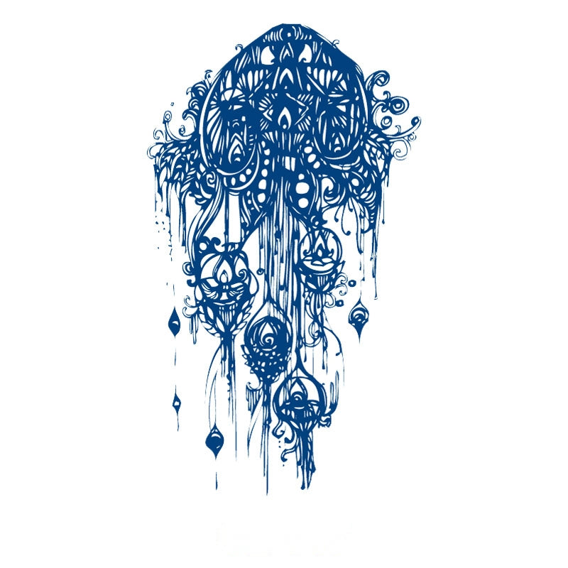 An ornate jellyfish drifting with flowing, tangled patterns.