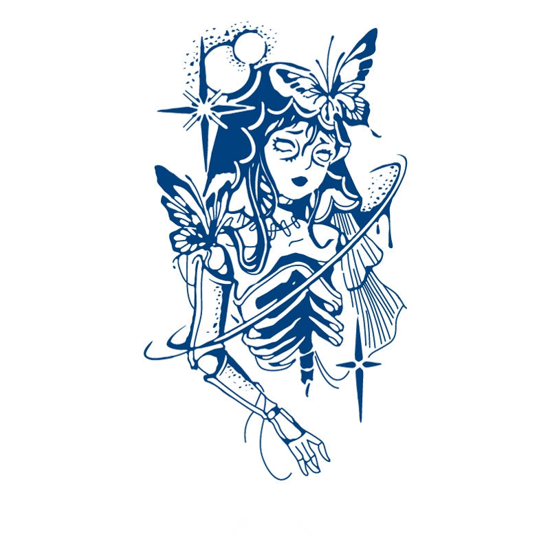 A celestial figure adorned with butterflies and cosmic rings, symbolizing transformation, transcendence, and the harmony between mortality and the infinite universe.