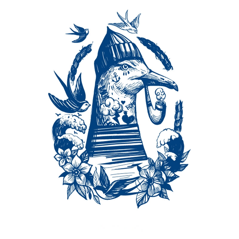 A seafaring bird adorned with tattoos and a sailor’s cap, framed by waves, swallows, and blossoms—symbolizing freedom, resilience, and the eternal call of adventure.