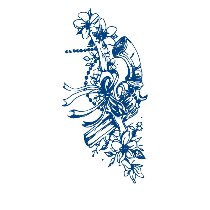 A revolver wrapped in flowing ribbons, pearls, and flowers, symbolizing the balance of elegance and danger—where grace conceals unyielding strength.