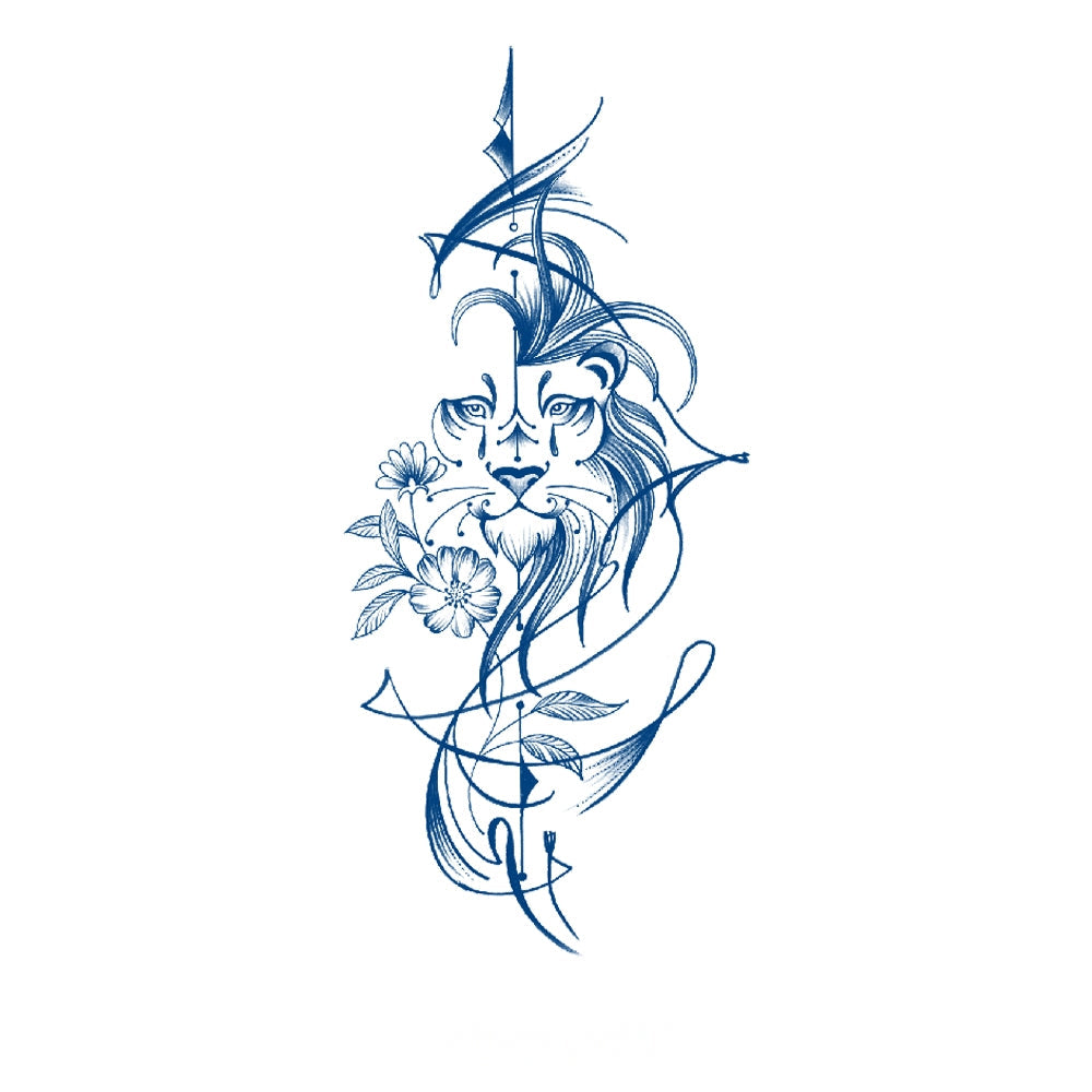 A regal lion framed by blooming flowers and sweeping vines, its fierce gaze softened by delicate curves—symbolizing courage, balance, and the harmony between wild power and gentle beauty.