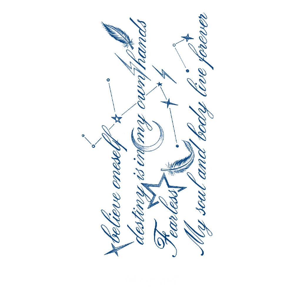 Interwoven stars, constellations, feathers, and lightning bolts embrace empowering words—believing in oneself, claiming destiny, living fearless—an emblem of cosmic guidance and the unbreakable will of the soul.