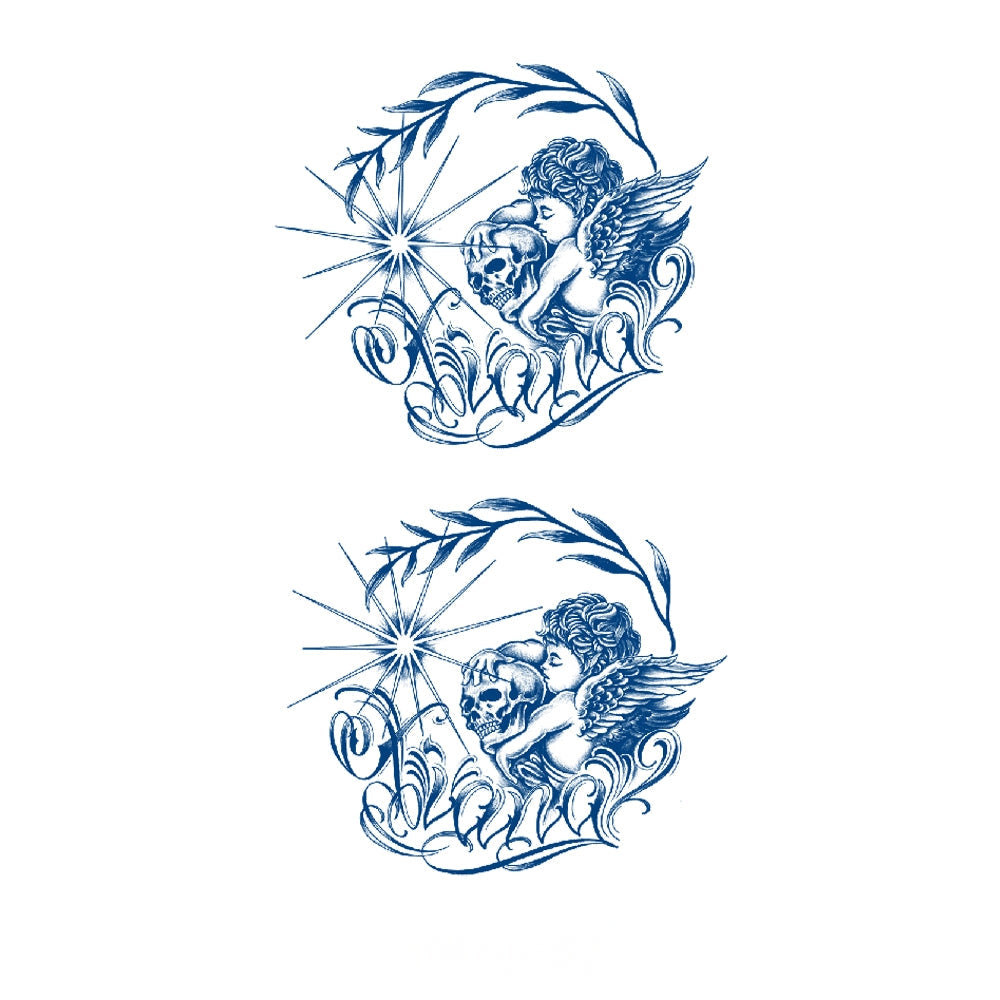 A cherub cradling a skull beneath radiant starlight, framed by flowing branches—an emblem of innocence meeting eternity, symbolizing the fragile balance between life, death, and divine protection.