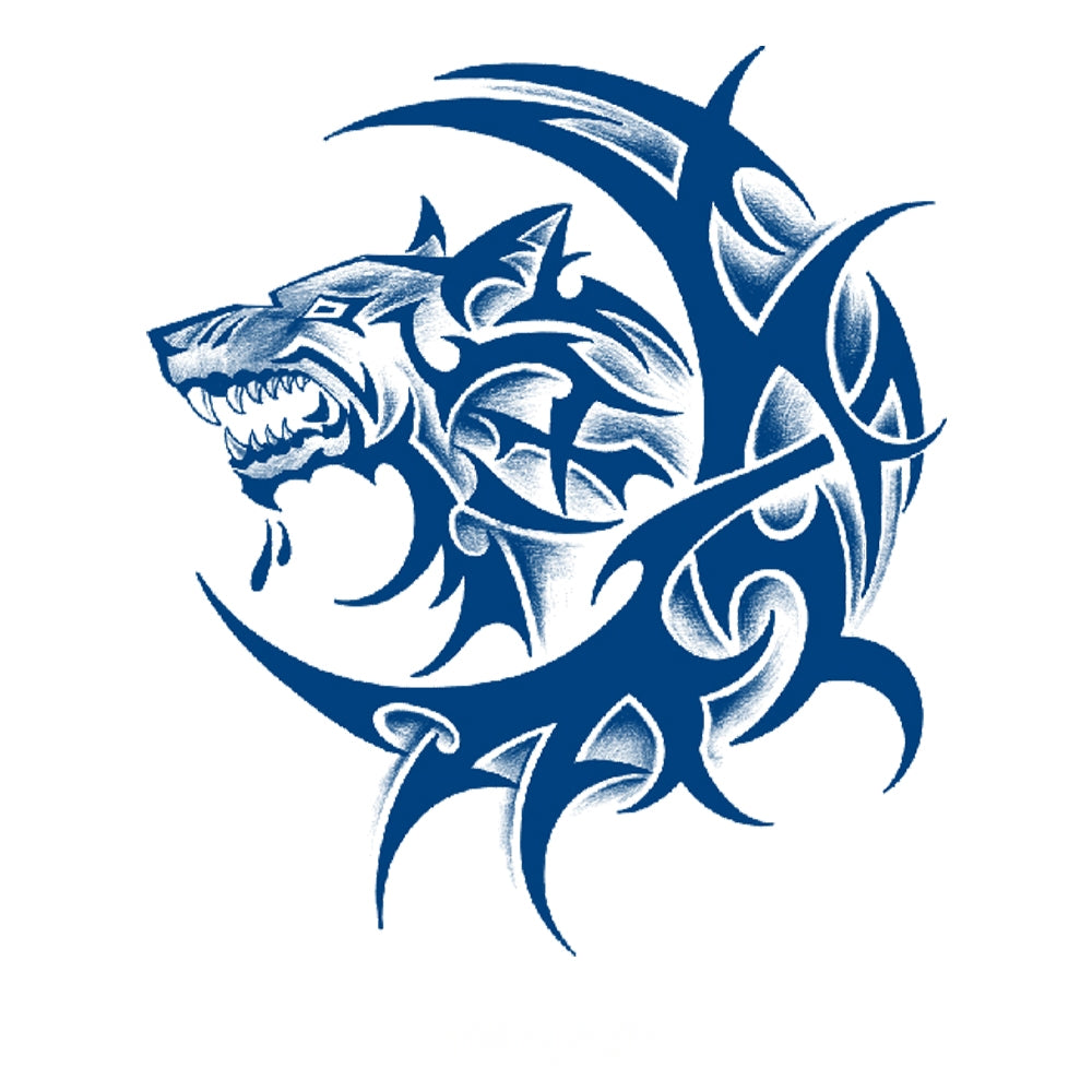 A feral wolf’s head snarling within a crescent of tribal blades, fangs dripping with raw power—symbolizing loyalty, ferocity, and the wild spirit that rises strongest under the moon’s call.