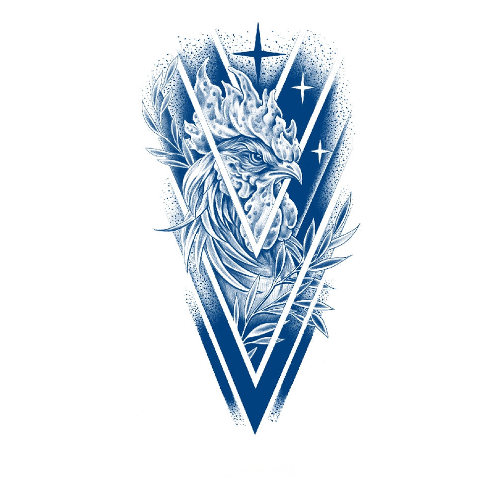 A regal rooster framed by radiant stars and geometric beams, symbolizing vigilance, rebirth, and the voice that calls forth light from the depths of darkness.