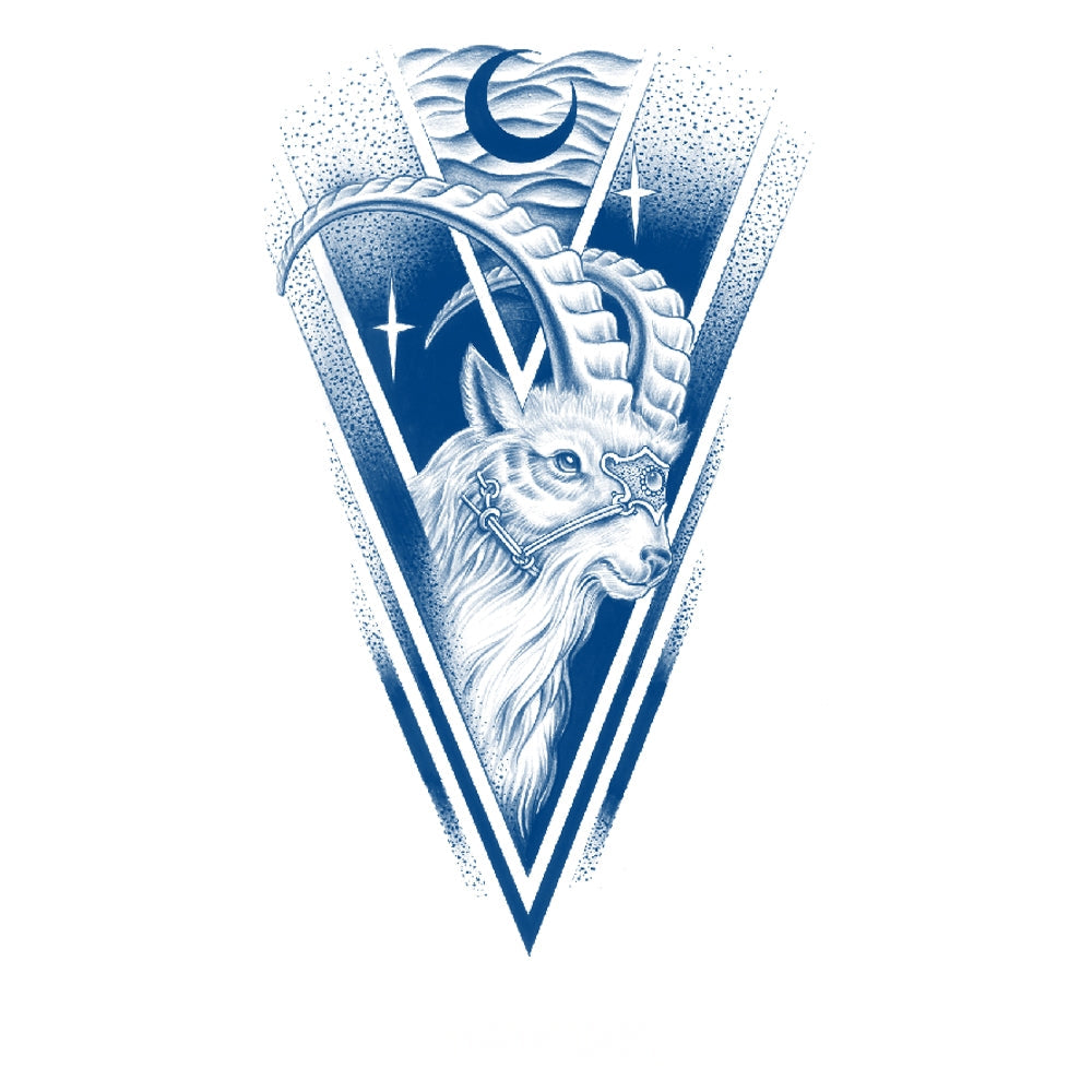 A steadfast goat crowned with monumental horns beneath the crescent moon and constellations, symbolizing discipline, resilience, and the unyielding climb toward destiny’s peak.
