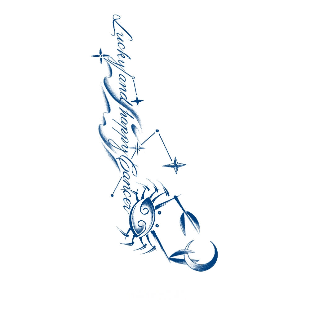 A celestial crab marked by its constellation and crescent moon, flowing alongside script—an emblem of intuition, protection, and the deep emotional currents that guide the soul.