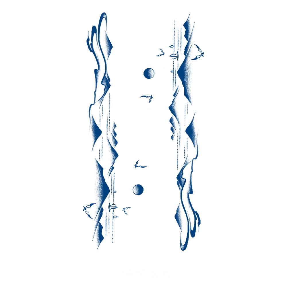 Mirrored landscapes divided by sun and moon, with swallows in flight between them—symbolizing duality, reflection, and the harmony of opposites where day meets night and earth meets sky.