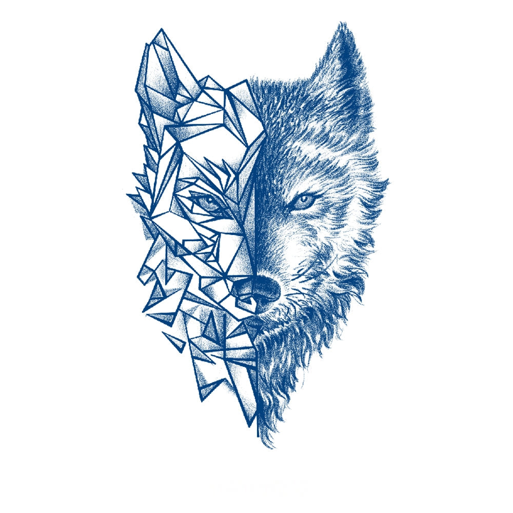 A wolf’s face split between raw realism and sharp geometric shards, symbolizing the duality of wild instinct and structured strength, embodying survival and transformation.