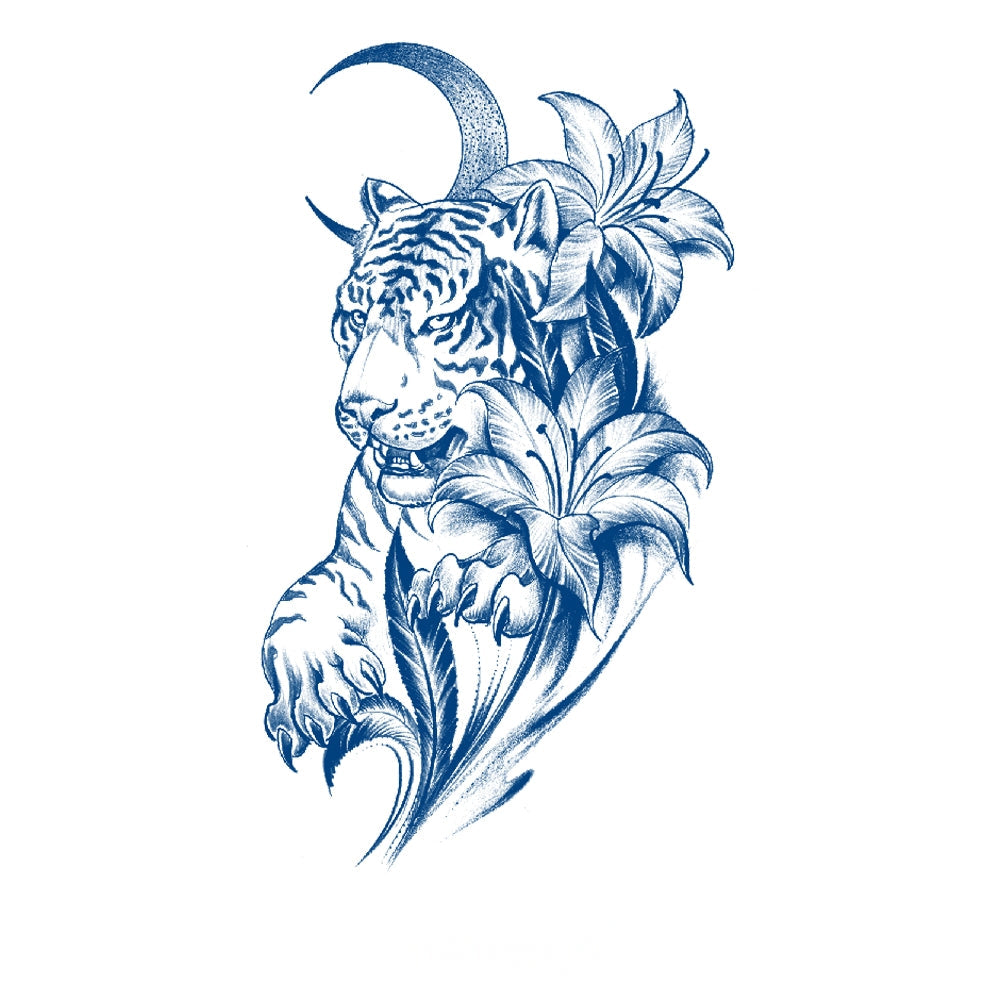 A fierce tiger emerging from lilies under the crescent moon, embodying the perfect harmony of beauty, stealth, and raw untamed power.