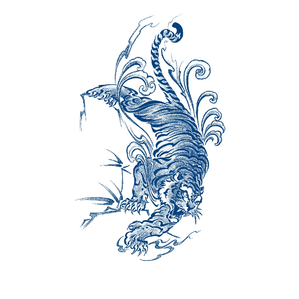 A fierce tiger descends with claws extended, wrapped in swirling energy and storm, symbolizing raw strength, courage, and unstoppable power.
