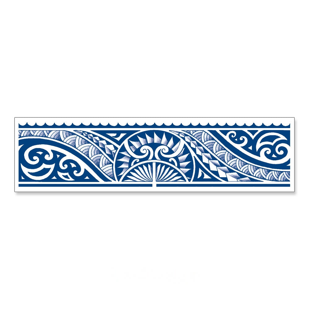 This Polynesian-inspired armband tattoo weaves flowing waves, sunbursts, and tribal motifs, symbolizing resilience, harmony, and protection. It carries the energy of the ocean and the guiding light of the sun, wrapping the arm in a timeless emblem of courage and balance.