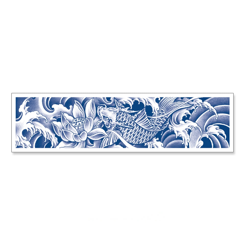 This armband tattoo depicts a koi fish swimming powerfully through waves beside a blooming lotus. The koi represents resilience, determination, and success against all odds, while the lotus symbolizes purity and rebirth. Together, they form an emblem of triumph, balance, and good fortune.